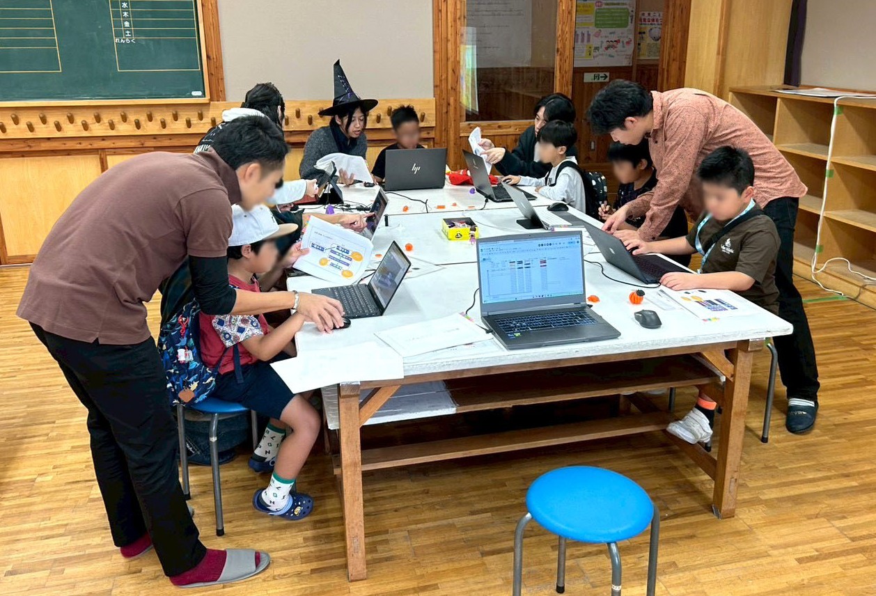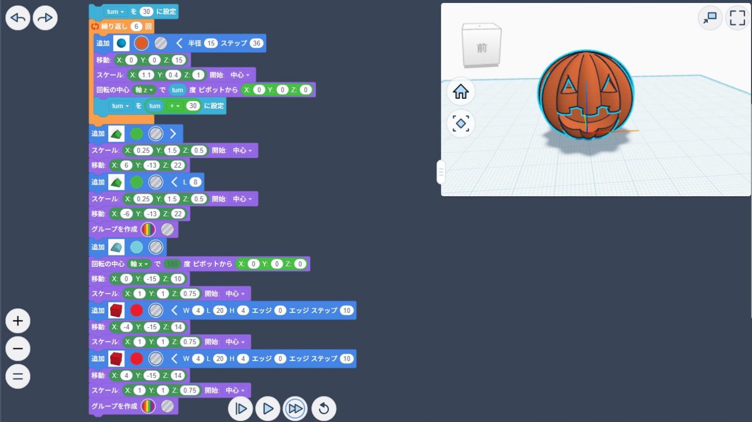 【パズルでモデリング】では、Tinkercadというモデリングソフトを用い、パズルのような感覚でモデリング体験をしてもらいました。あらかじめハロウィンをモチーフにした見本を作り、当日はその見本を再現して作品を作ってもらいました。