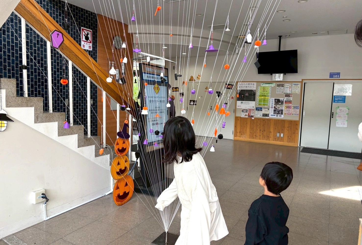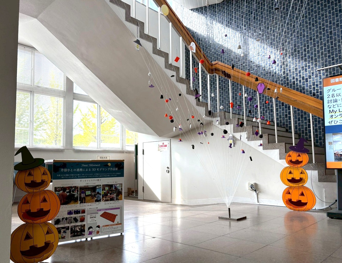 C3棟の階段の吹き抜けを利用したこのオーナメント展示は、階段の手すりに結んだ糸を一点に集めた逆円錐形となっています。そして、この糸に結んでいるのが、芹っ子ふれあいフェスタで小学生に作成してもらったモデリング作品なんです!